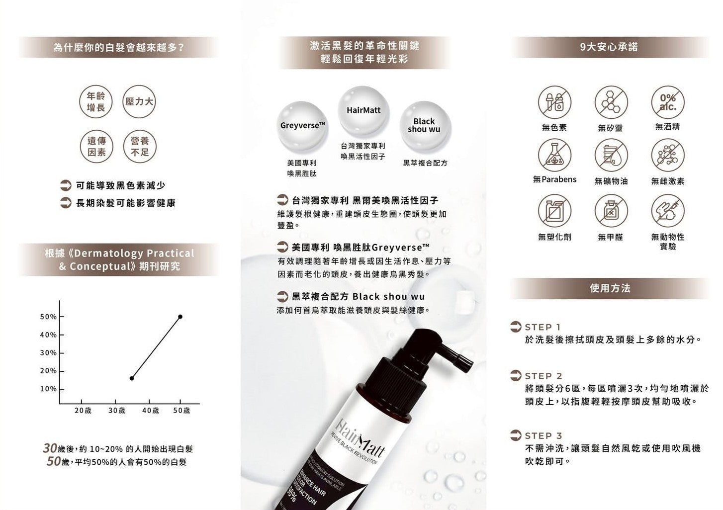 Say goodbye to premature gray hair and welcome a youthful, vibrant scalp with HairMatt Revive Black Revolution — an advanced formula powered by exclusive Taiwanese and U.S. patented ingredients designed to restore the natural blackness of your hair from the root!